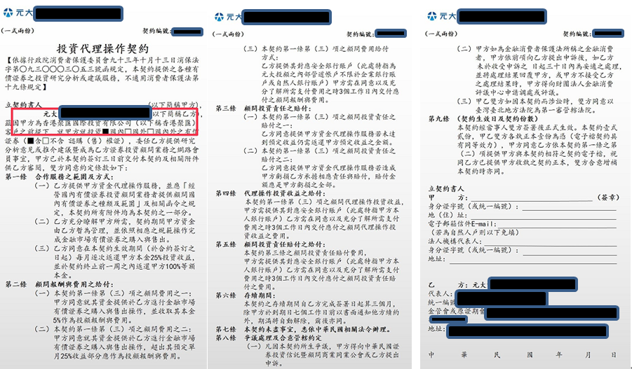 近期有不明人士以「香港聚匯國際投資有限公司」名義,偽稱可轉介客戶與本公司簽約,由本公司提供投資建議、代為操作資金,並冒用本公司名義製作不實契約文件,藉以欺騙大眾(如下圖)。本公司特此再為澄清,本公司不會代投資人操作資金,任何人藉本公司名義、或稱其與本公司有合作關係,向投資人勸誘交付財物,皆屬詐騙,敬請務必提高警覺。如有任何疑問,請立即連繫本公司(客服信箱:ytrs@yuanta.com,客服專線:(02) 7752-3130)。