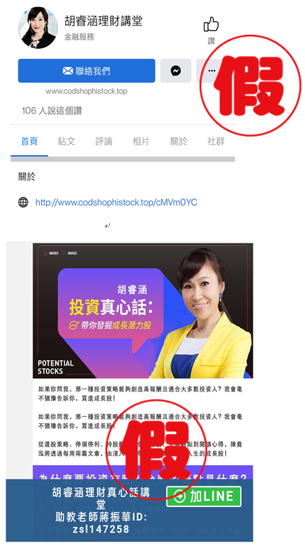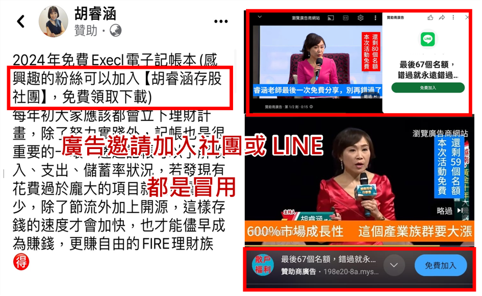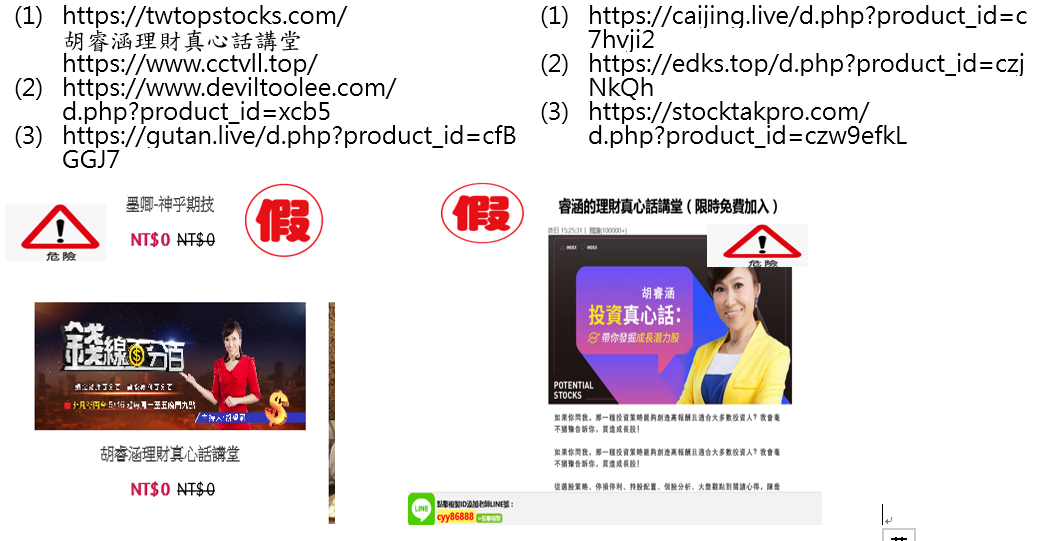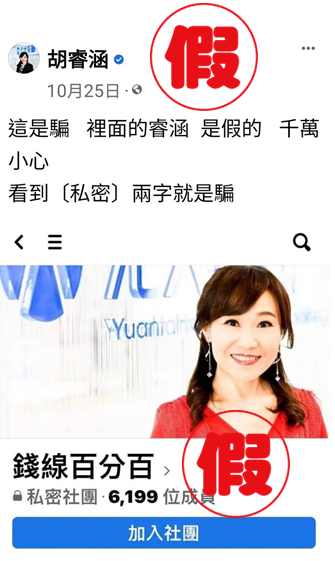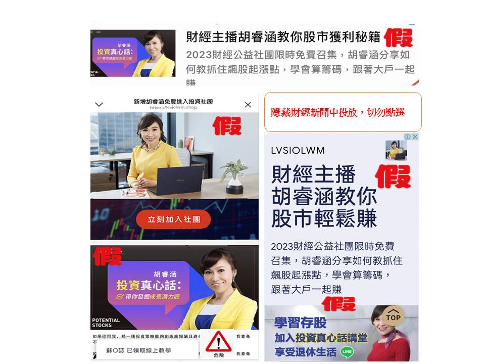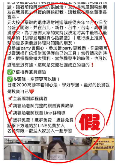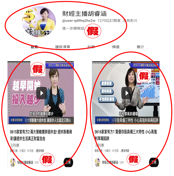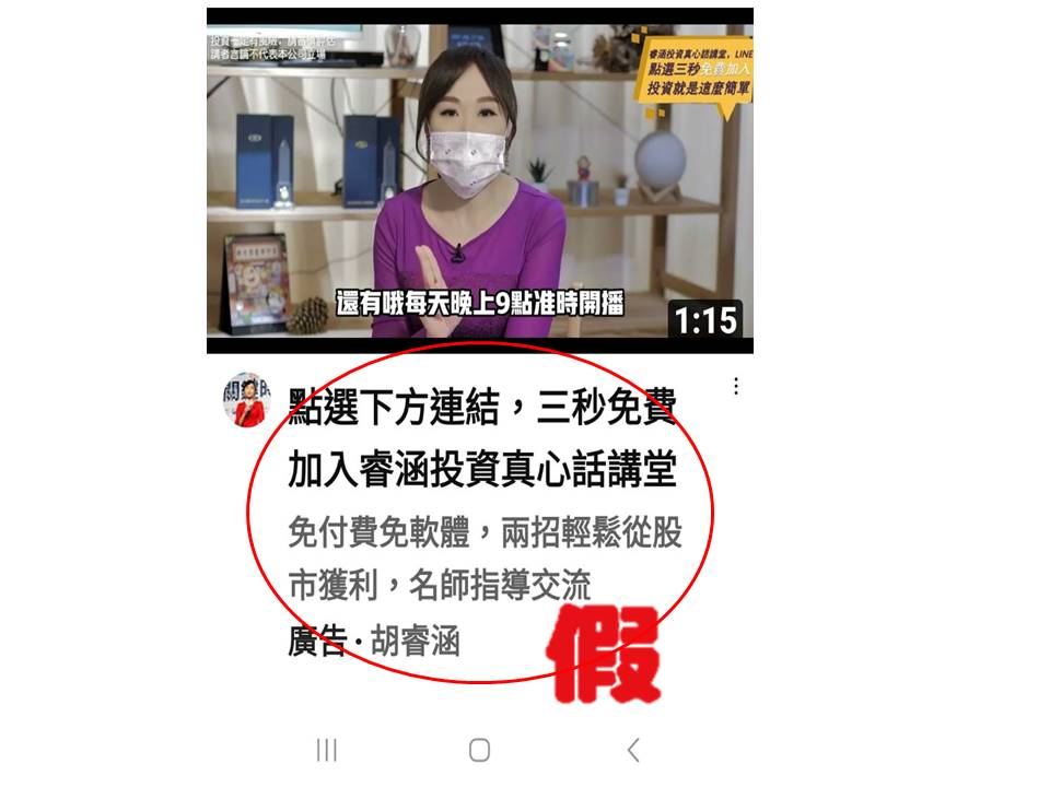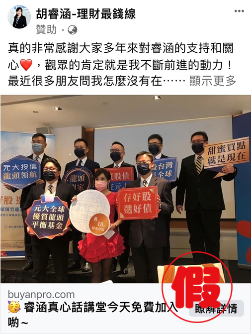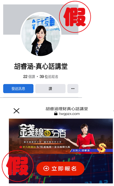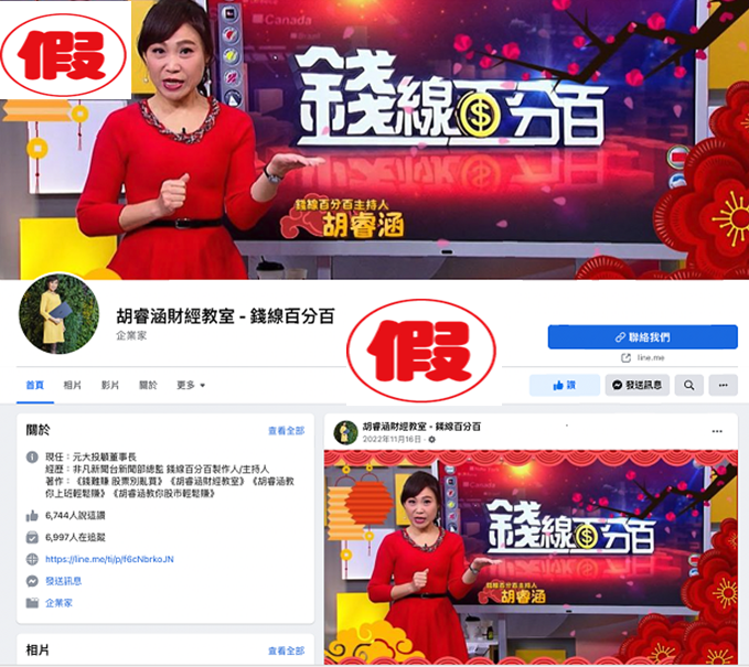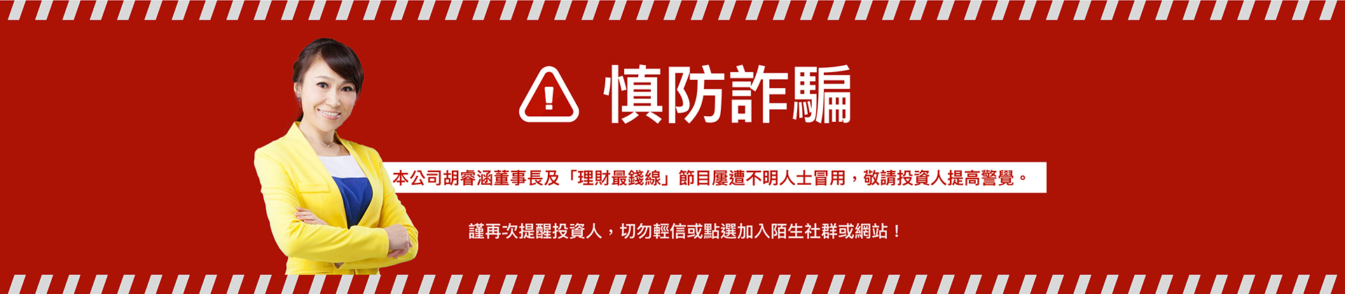 近期有不明人士冒用本公司「理財最錢線」節目、胡睿涵董事長名義,盜用照片,冒名成立(FB)臉書專頁及社群網站。甚有在YouTube製作假(影片)廣告,頻繁投放,致社會大眾誤認,藉此誘使點選假網站或「加Line」或成為投資群組會員或稱可提供投資建議、個股等情形。本公司特此澄清,任何人藉本公司、董事或員工名義、或稱其有合作關係,提供投資個股或策略,勸誘交付財物或個人資料,皆屬詐騙,敬請投資人提高警覺,切勿輕信或點選加入陌生社群或網站,以免權益受損(財物損失或個人資料遭竊)。
